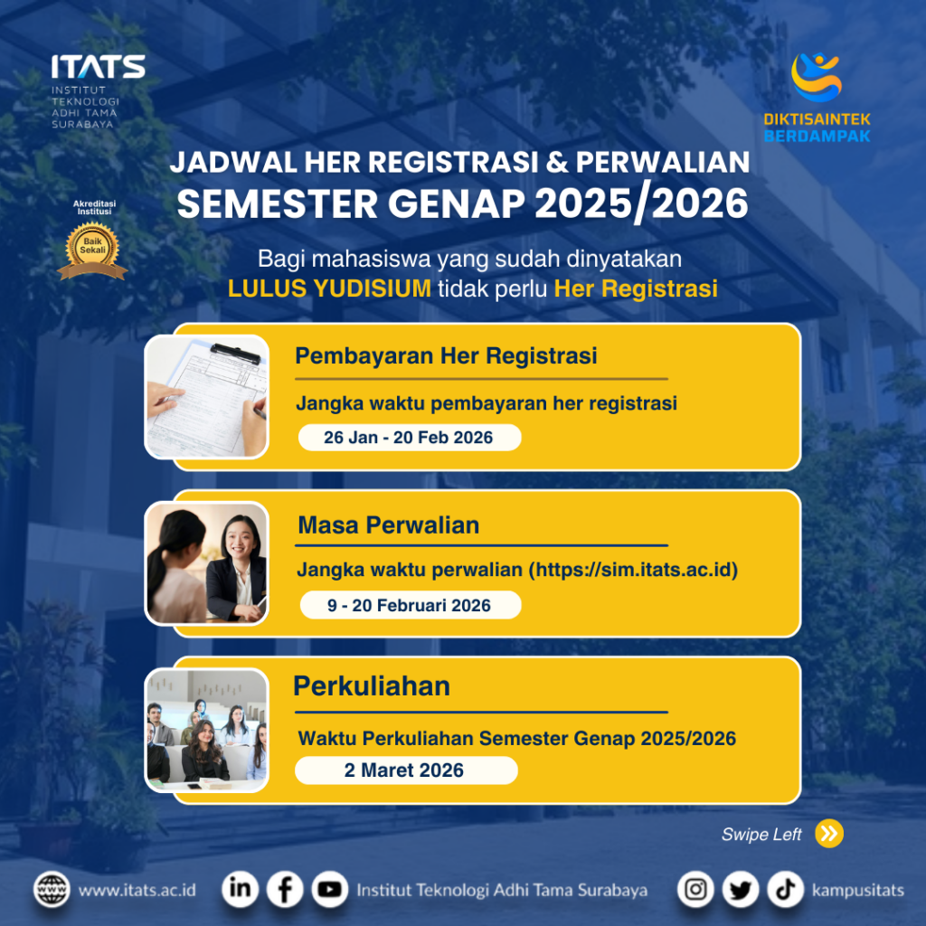 Diberitahukan kepada seluruh mahasiswa bahwa sesuai Surat Edaran Wakil Rektor Bidang Akademik dan Pembelajaran Nomor: 04.A/WRI/ITATS/I/2026, terdapat ketentuan sebagai berikut: