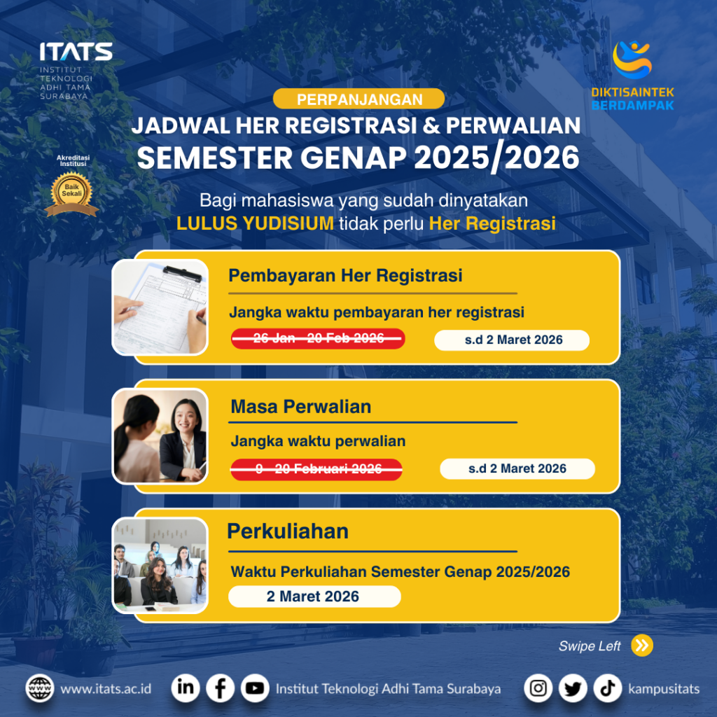 Merujuk Surat Wakil Rektor Bidang Akademik dan Pembelajaran Nomor 13/WR I/ITATS/II/2026, tentang perpanjangan masa pembayaran her-registrasi dan perwalian Semester Genap Tahun Akademik 2025/2026, disampaikan kepada seluruh mahasiswa bahwa: