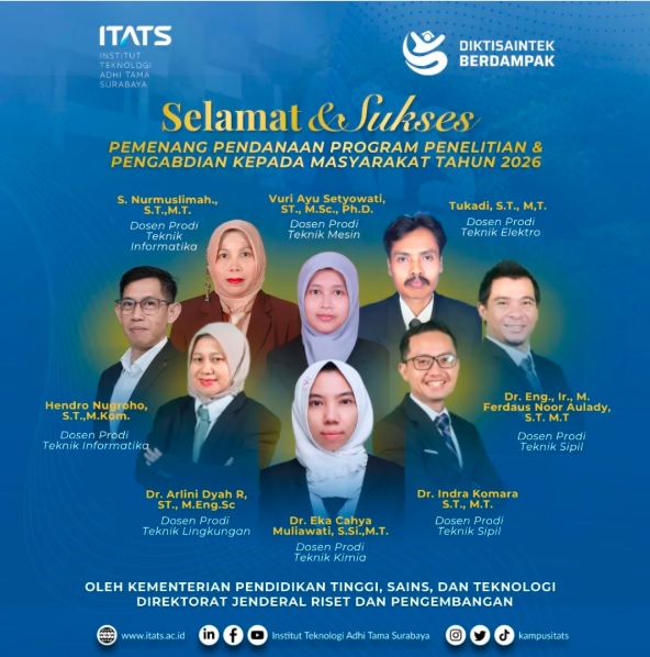 Kepada 8 dosen ITATS, atas pencapaiannya sebagai Pemenang Penerima Pendanaan Penelitian dan Pengabdian Kepada Masyarakat Tahun Anggaran 2026, yang diselenggarakan oleh Kementerian Pendidikan Tinggi, Sains, dan Teknologi melalui Direktorat Jenderal Riset dan Pengembangan. Apresiasi setinggi-tingginya kepada: