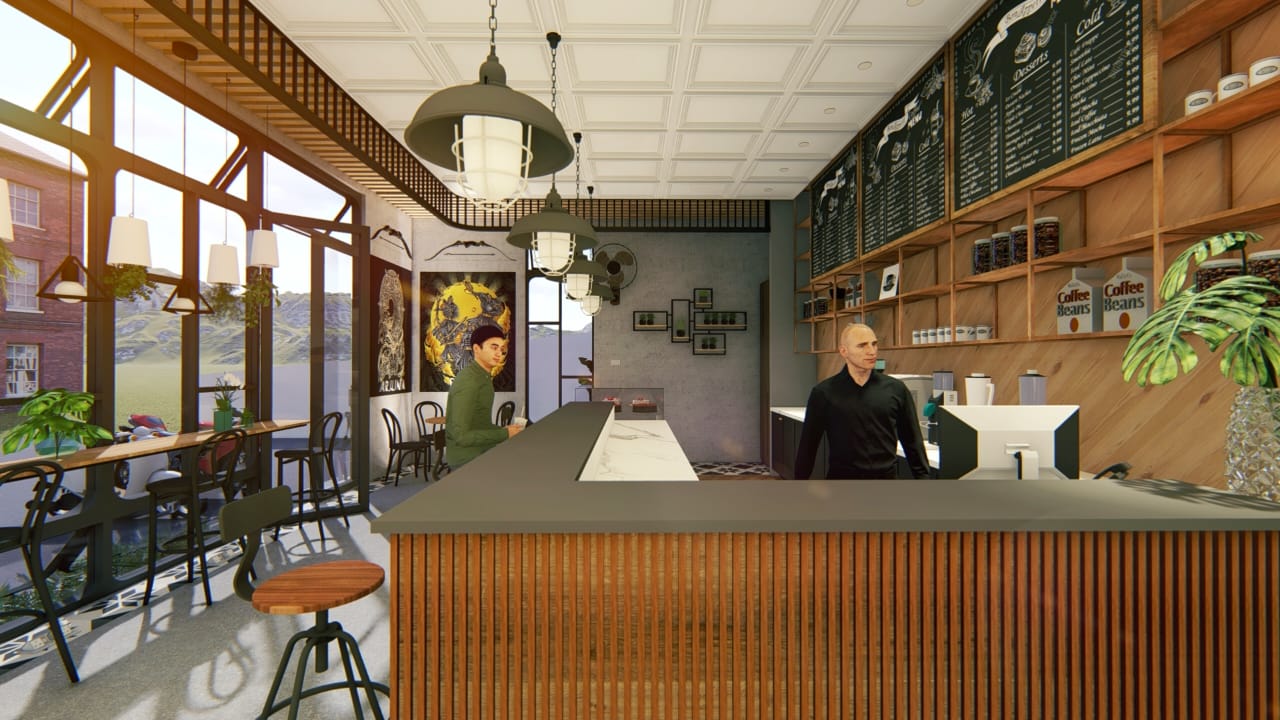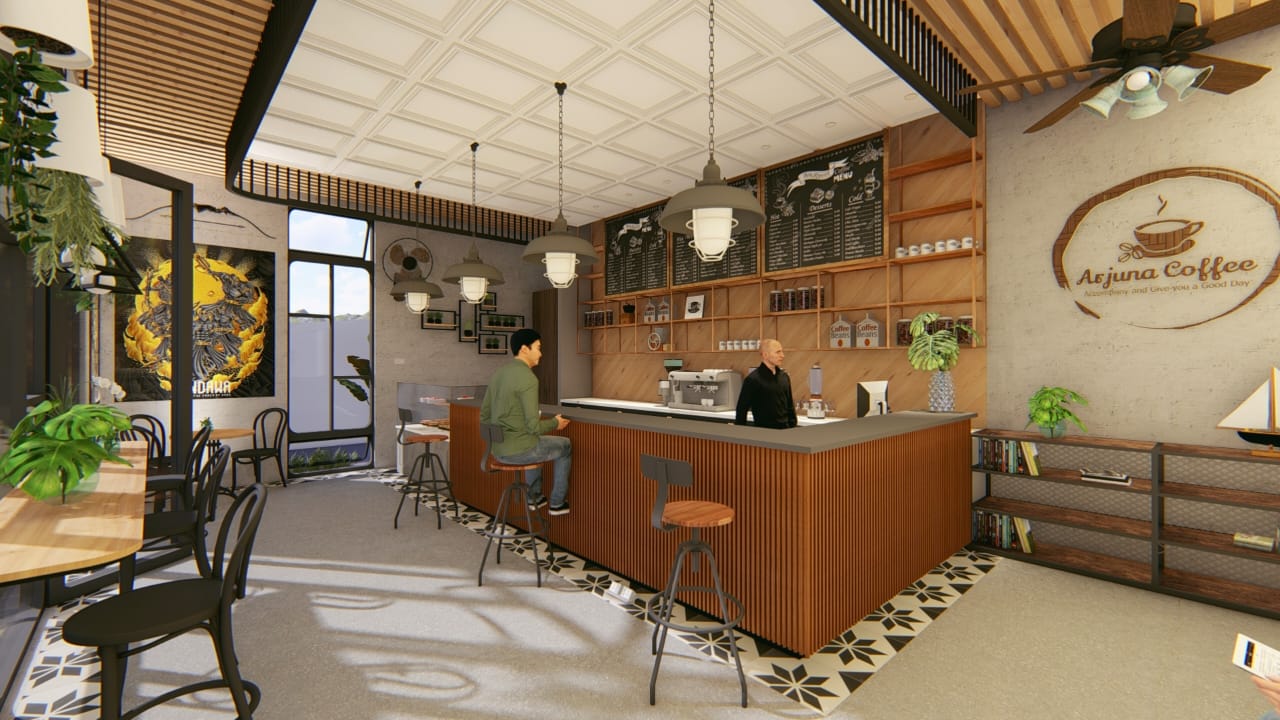 Pada konsep yang diusung oleh Syahrian dan Sukrisno yaitu memberikan tempat atau ruang untuk para pengunjung sebagai tempat bersua foto yang menghadirkan nuansa tradisional seperti menampilkan gambar wayang Arjuna. Selain sebagai tempat foto, konsep ini bertujuan untuk mengenalkan pewayangan kepada pengunjung yang sesuai dengan tema dari café ini yaitu Tradisional Modern.