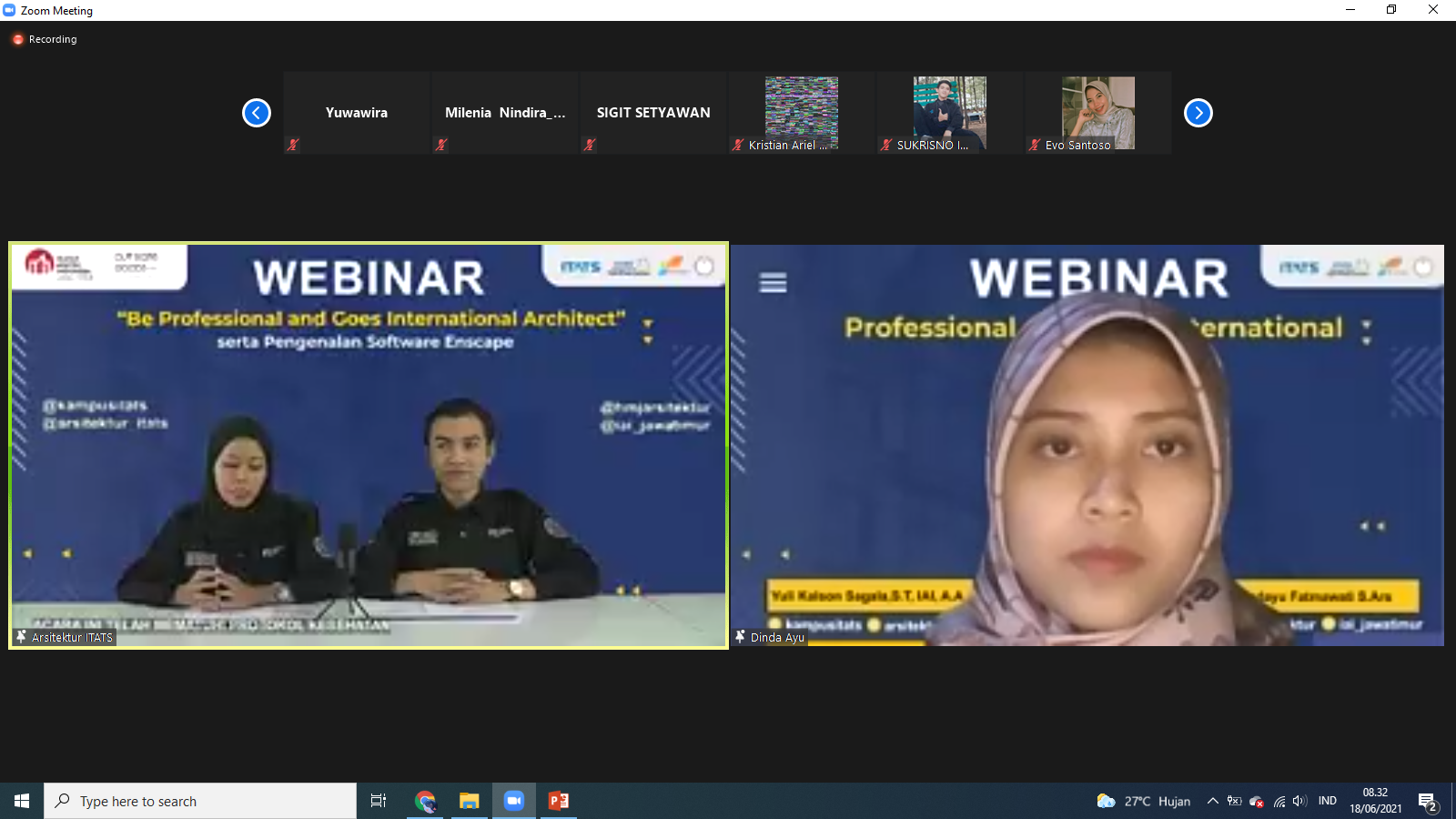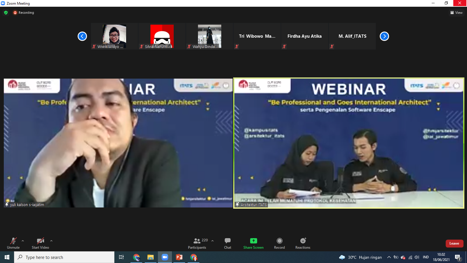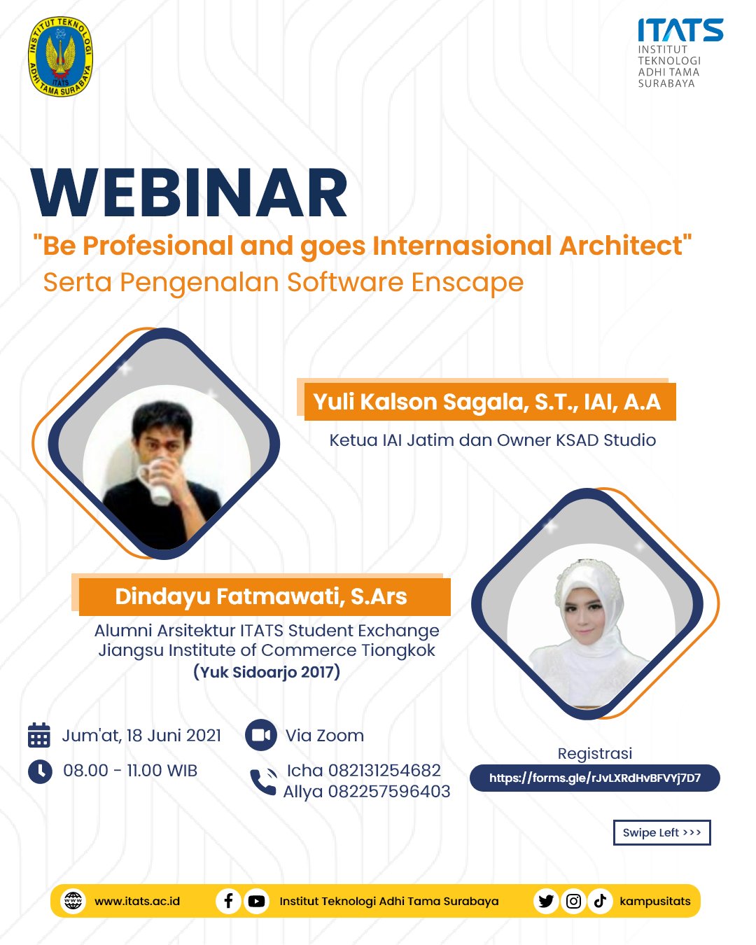 Pada 18 Juni 2021 kemarin, Jurusan Arsitektur mengadakan Webinar dan Workshop berjudul “Be Professional and Goes International Architect” Serta Pengenalan Software Enscape. Acara ini merupakan rangkaian acara Seminar online ke 2 yang dilakukan oleh Jurusan Arsitektur ITATS bersama HMJ Arsitektur ITATS sebelumnya. Webinar dan Workshop “Be Professional and Goes International Architect” Serta Pengenalan Software Enscape ini mengundang Bapak Yuli Kalson Sagala ST, IAI, AA selaku Ketua IAI (Ikatan Arsitektur Indonesai) Wil Jawa Timur dan juga Founder KSAD Studio. Serta mengundang Alumnus Jurusan Arsitektur yang pernah mengikuti pertukaran pelajar ke Jiangsu Institute of Commerce Tiongkok, Dindayu Fatmawati S.Ars yang juga pernah menyandang gelar Yuk Sidoarjo 2017 dan sekarang menjadi Profesional Model.