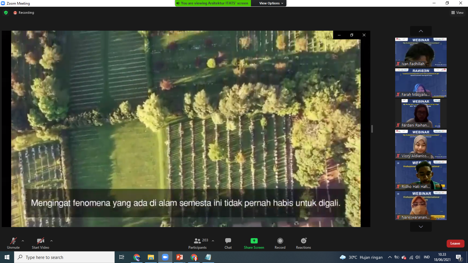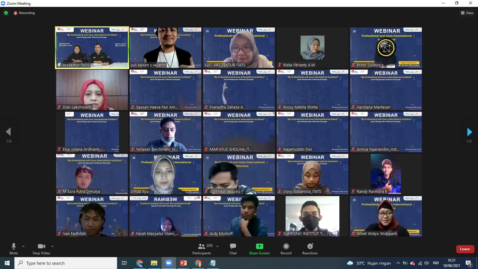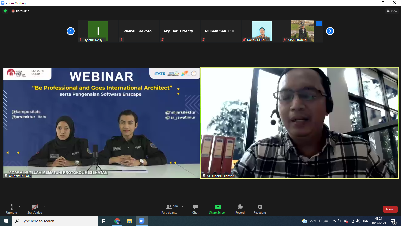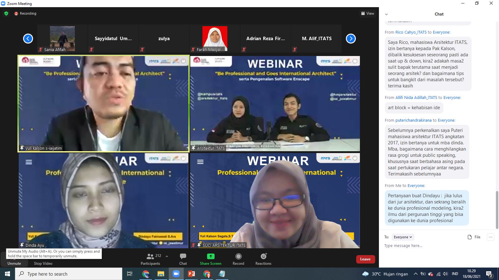 Pada 18 Juni 2021 kemarin, Jurusan Arsitektur mengadakan Webinar dan Workshop berjudul “Be Professional and Goes International Architect” Serta Pengenalan Software Enscape. Acara ini merupakan rangkaian acara Seminar online ke 2 yang dilakukan oleh Jurusan Arsitektur ITATS bersama HMJ Arsitektur ITATS sebelumnya. Webinar dan Workshop “Be Professional and Goes International Architect” Serta Pengenalan Software Enscape ini mengundang Bapak Yuli Kalson Sagala ST, IAI, AA selaku Ketua IAI (Ikatan Arsitektur Indonesai) Wil Jawa Timur dan juga Founder KSAD Studio. Serta mengundang Alumnus Jurusan Arsitektur yang pernah mengikuti pertukaran pelajar ke Jiangsu Institute of Commerce Tiongkok, Dindayu Fatmawati S.Ars yang juga pernah menyandang gelar Yuk Sidoarjo 2017 dan sekarang menjadi Profesional Model.