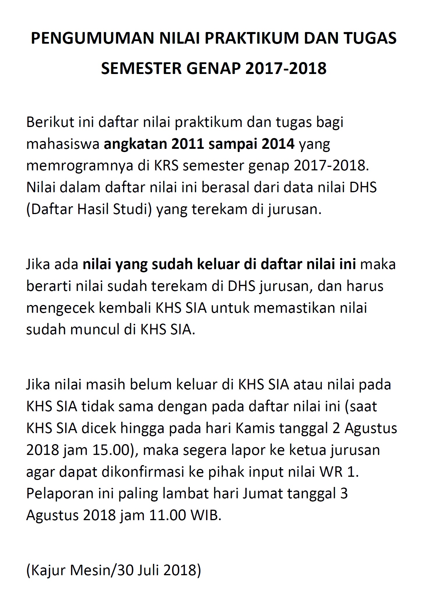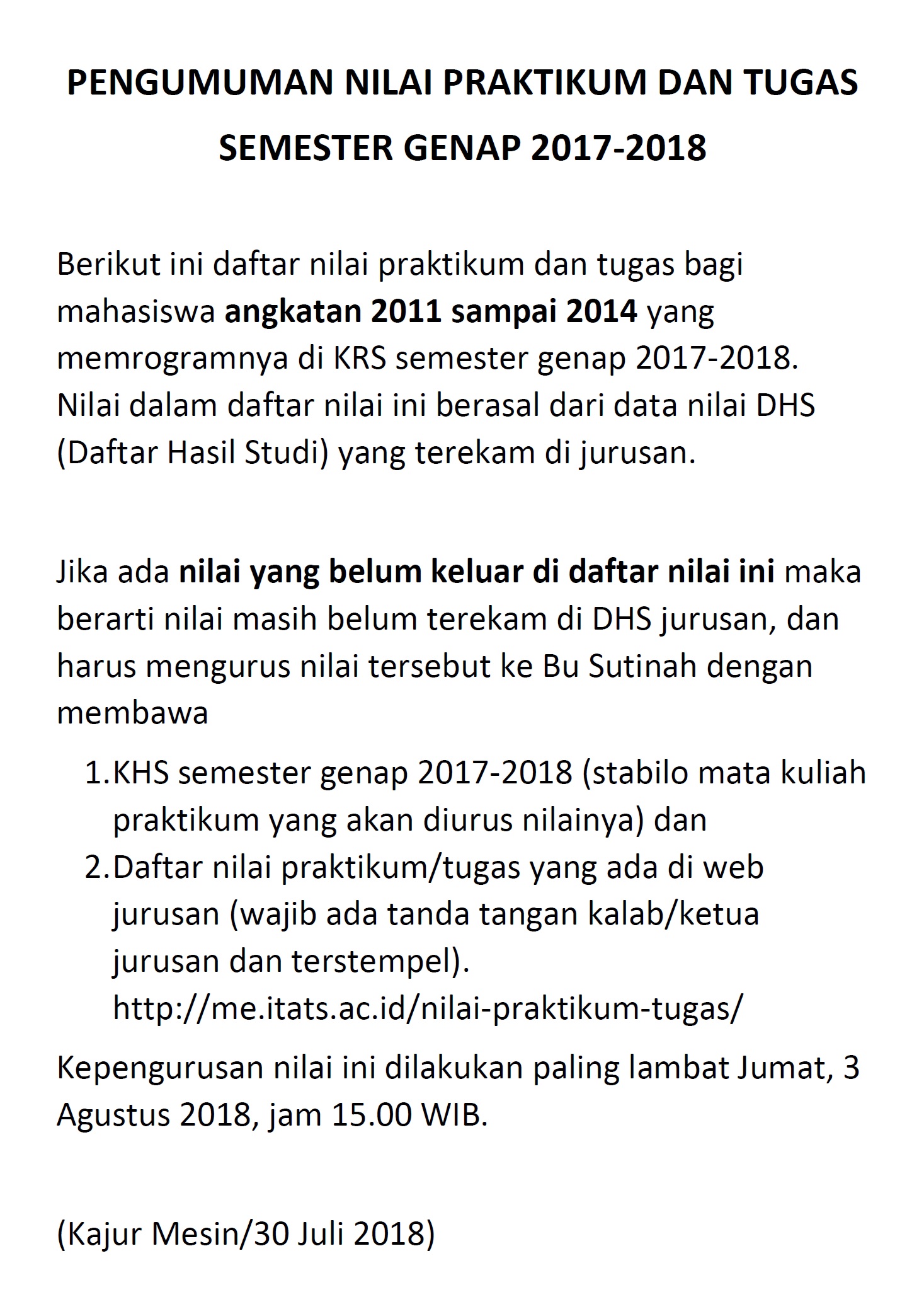 Pengumuman Nilai Praktikum dan Tugas Semester Genap 2017-2018