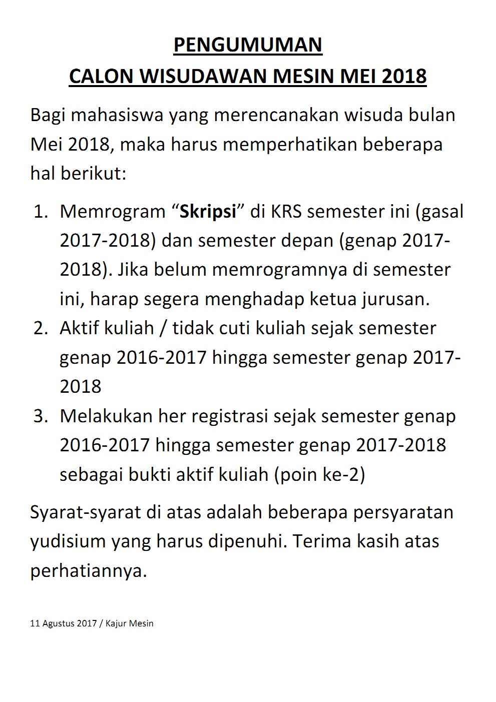 (Pengumuman Calon Wisudawan Mesin Mei 2018)