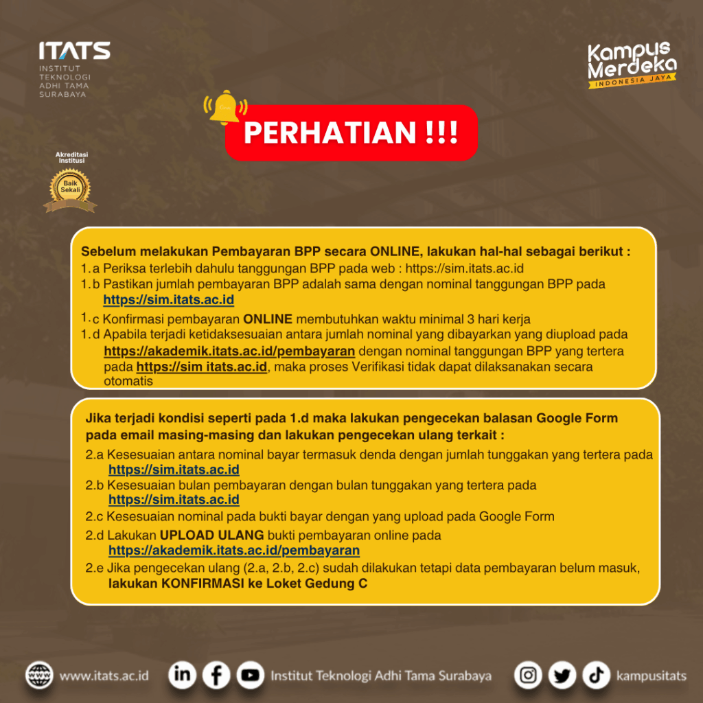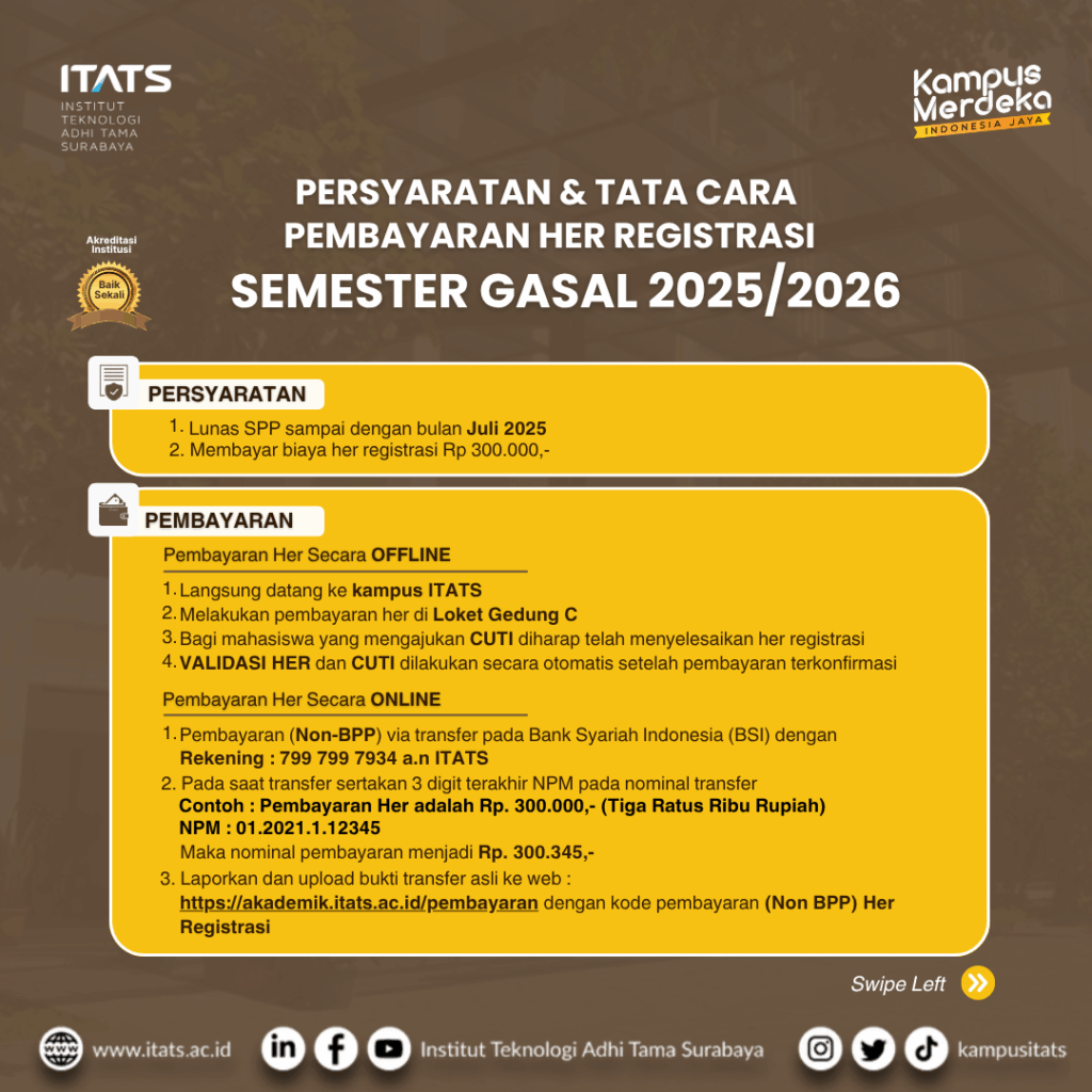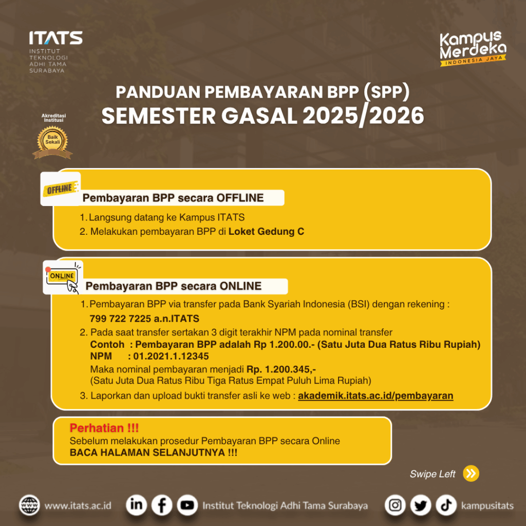 💳 Pembayaran BPP & Her Registrasi bisa dilakukan offline di Loket Gedung C atau online via transfer BSI a.n ITATS (detail cek di web akademik).
