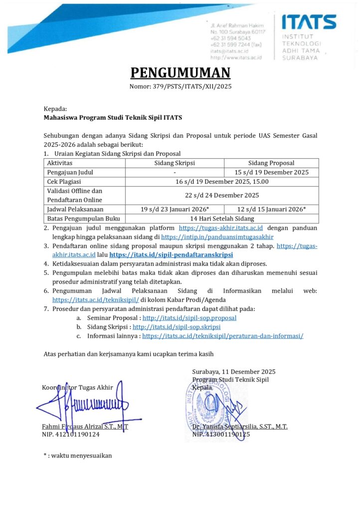 Surabaya, 20 Februari 2025 – Institut Teknologi Adhi Tama Surabaya (ITATS) mengadakan sosialisasi proposal skripsi dan skripsi pada Rabu, 19 Februari 2025, secara daring/online. Acara ini dihadiri oleh mahasiswa Teknik Sipil yang akan mengambil mata kuliah Proposal Skripsi dan Skripsi, sebagai langkah awal dalam mempersiapkan tugas akhir mereka. Dalam sosialisasi ini, mahasiswa diberikan panduan lengkap…
