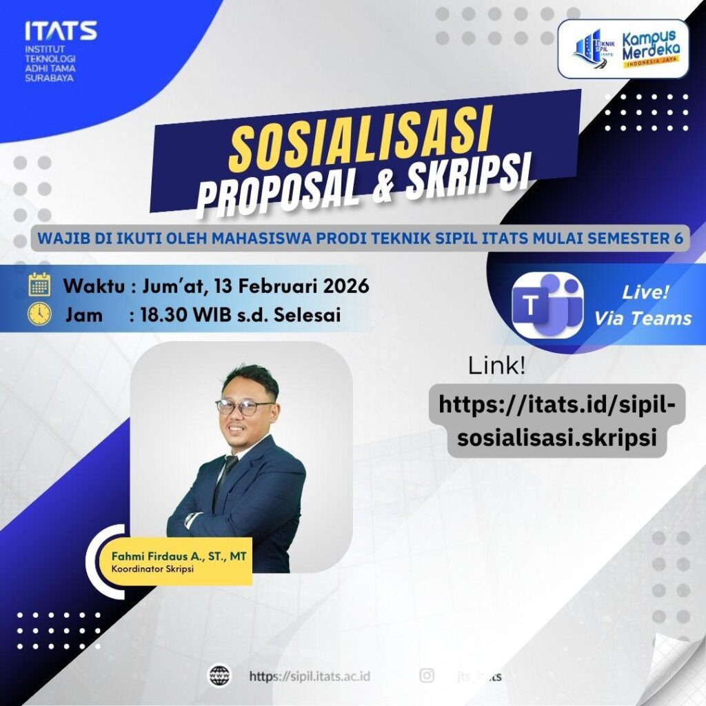 Pada sore hari ini telah dilaksanakan sosialisasi yang dipimpin oleh Bapak Kaprodi Teknik Sipil ITATS bersama Koordinator Tugas Akhir. Kegiatan tersebut membahas beberapa poin penting yang berkaitan dengan pelaksanaan ekivalensi mata kuliah, penyusunan proposal, serta skripsi mahasiswa. Dalam kesempatan tersebut, Bapak Kaprodi menjelaskan ketentuan terbaru mengenai ekivalensi mata kuliah, termasuk alur dan prosedur yang harus…